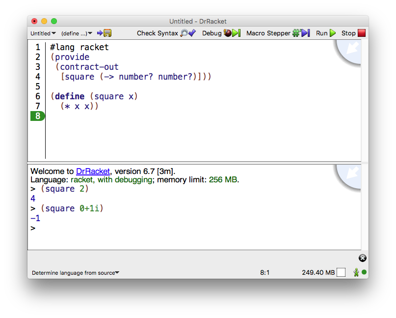Clicking the Run button evaluates the program in the definitions window, making the program’s definitions available in the interactions window. Given the definition of square as in the figure above, typing (square 2) in the interactions window produces the result 4. Clicking the Run button again resets the interactions window and re-evaluates the definitions window.